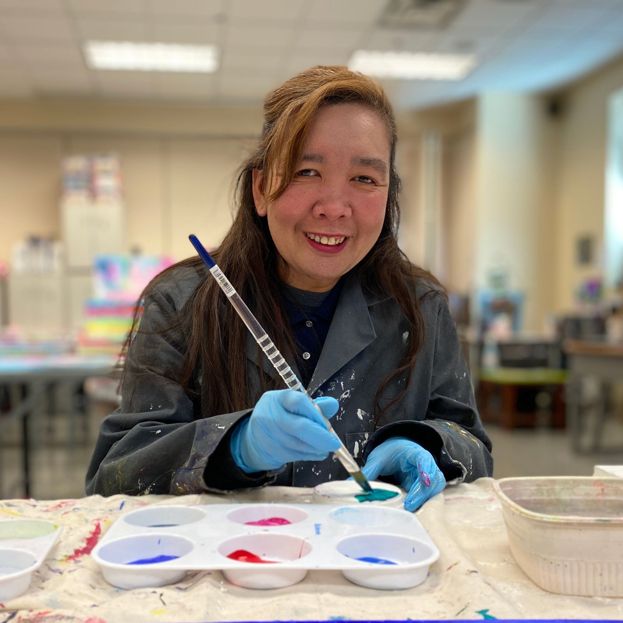 Andrea's favorite thing to draw is hearts. She enjoys using stencils and colored pencils because they are easier to shade with. She likes to listen to music while creating.