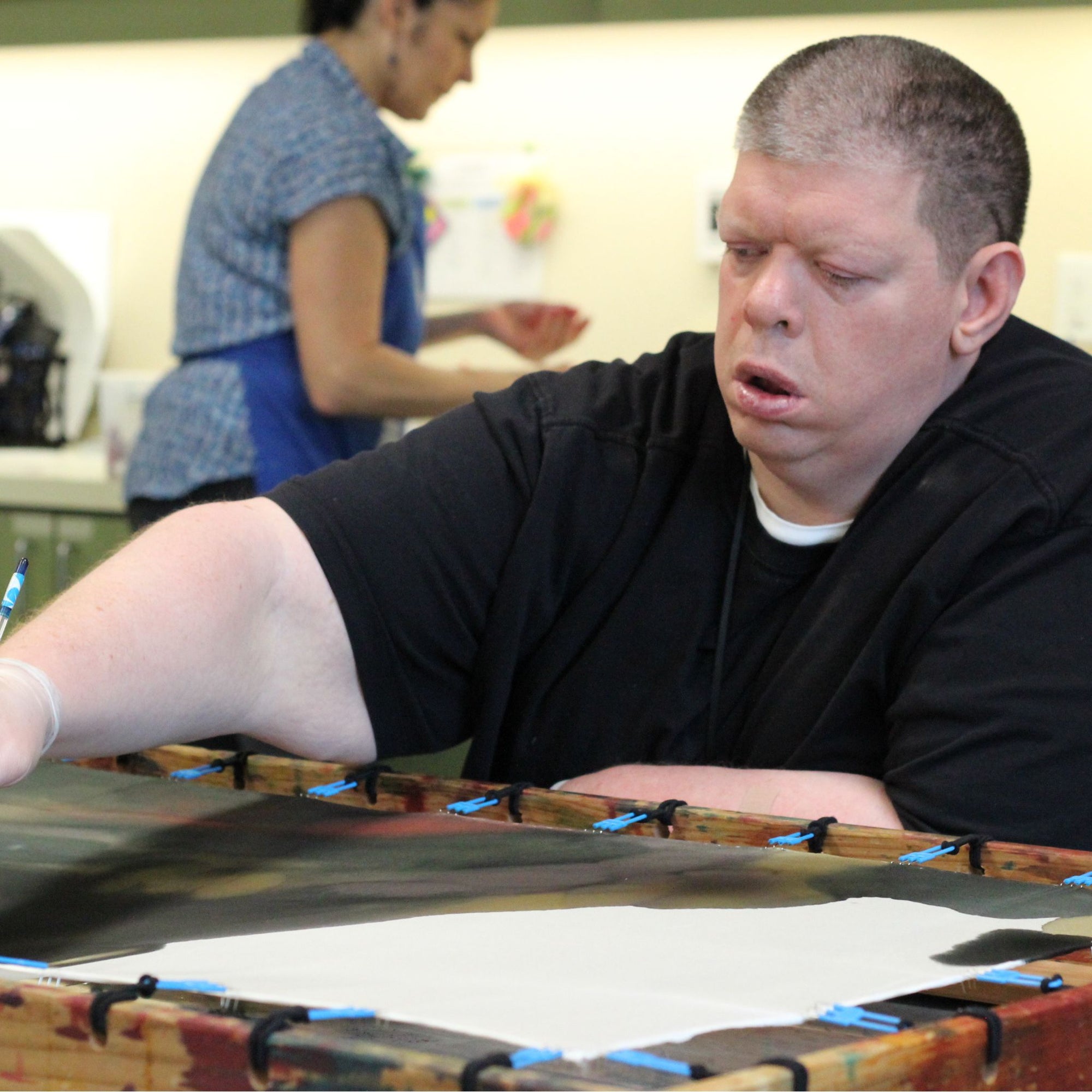 Chad's work is primarily inspired by characters and text from his favorite TV shows. Chad tends to refer to his finished works in acrylic paint as "skies." His brush strokes are very fast and fill the canvas quickly. Chad also writes and creates beautiful silk scarves.
