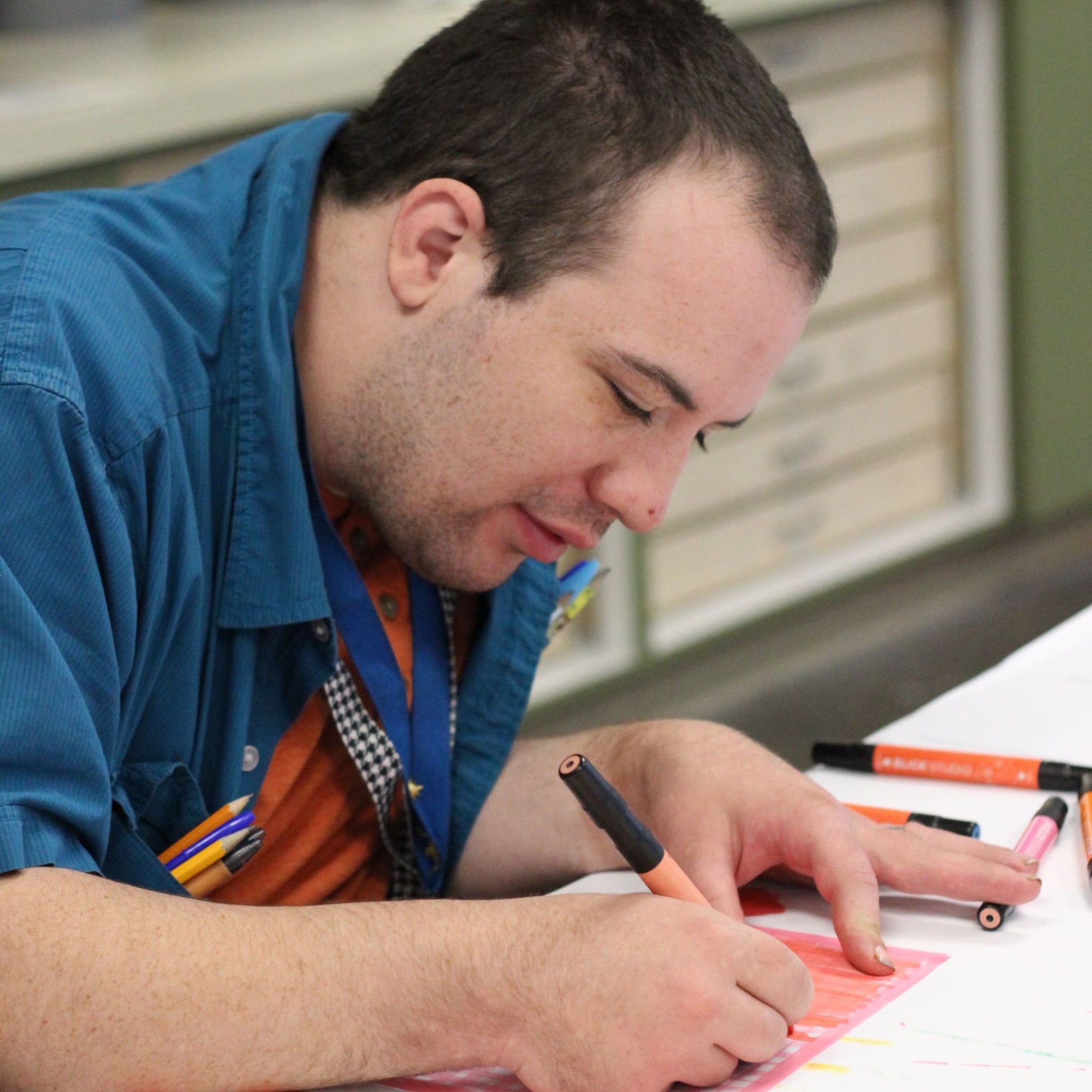 Chris is drawn to secret codes, numbers and their keys, which he maps out over any given surface with marker pens. When not using those symbols, his work is characterized by horizontal and vertical grids of lines and bands of stripes in different colors.