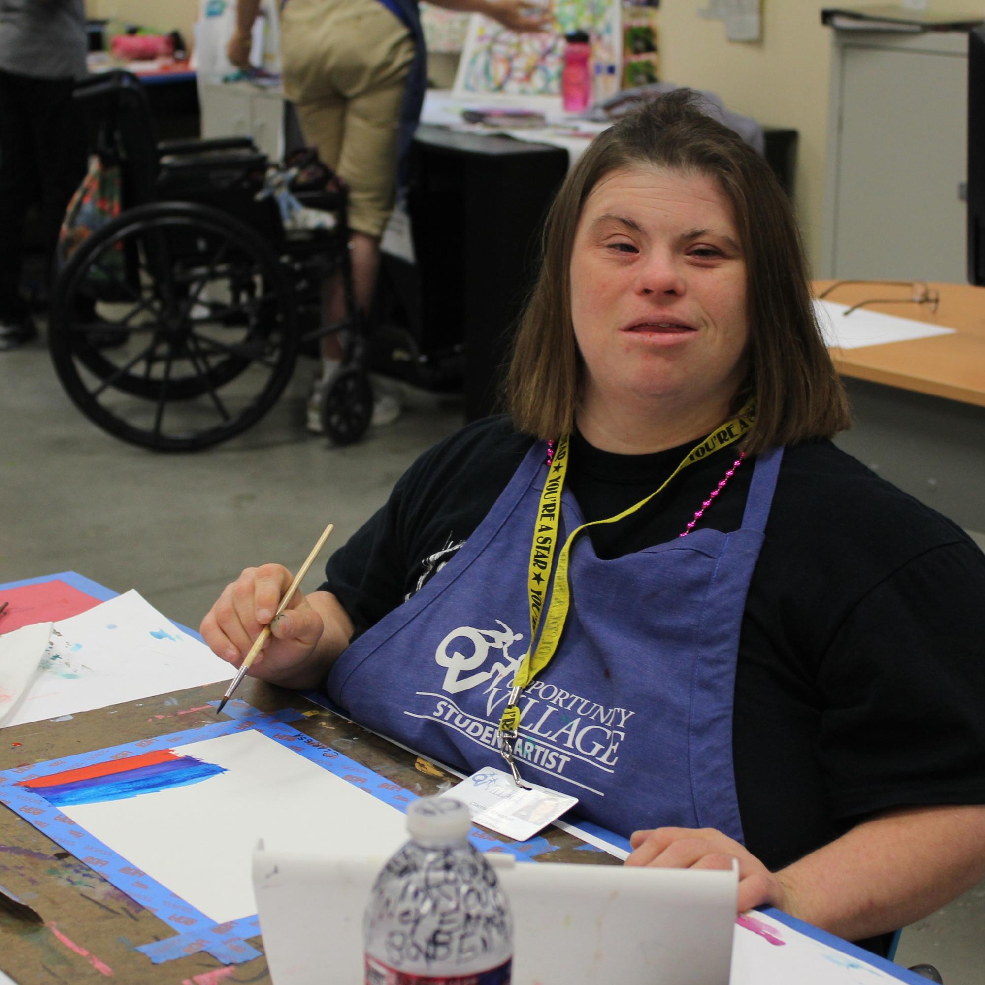 Clarissa likes abstract compositions which often feature a shape of hearts in the center. Recently she has advanced to multi-shaped, interlocked blocks of blue and red, sometimes in pastel hues, often in company with a small field of yellow and black.