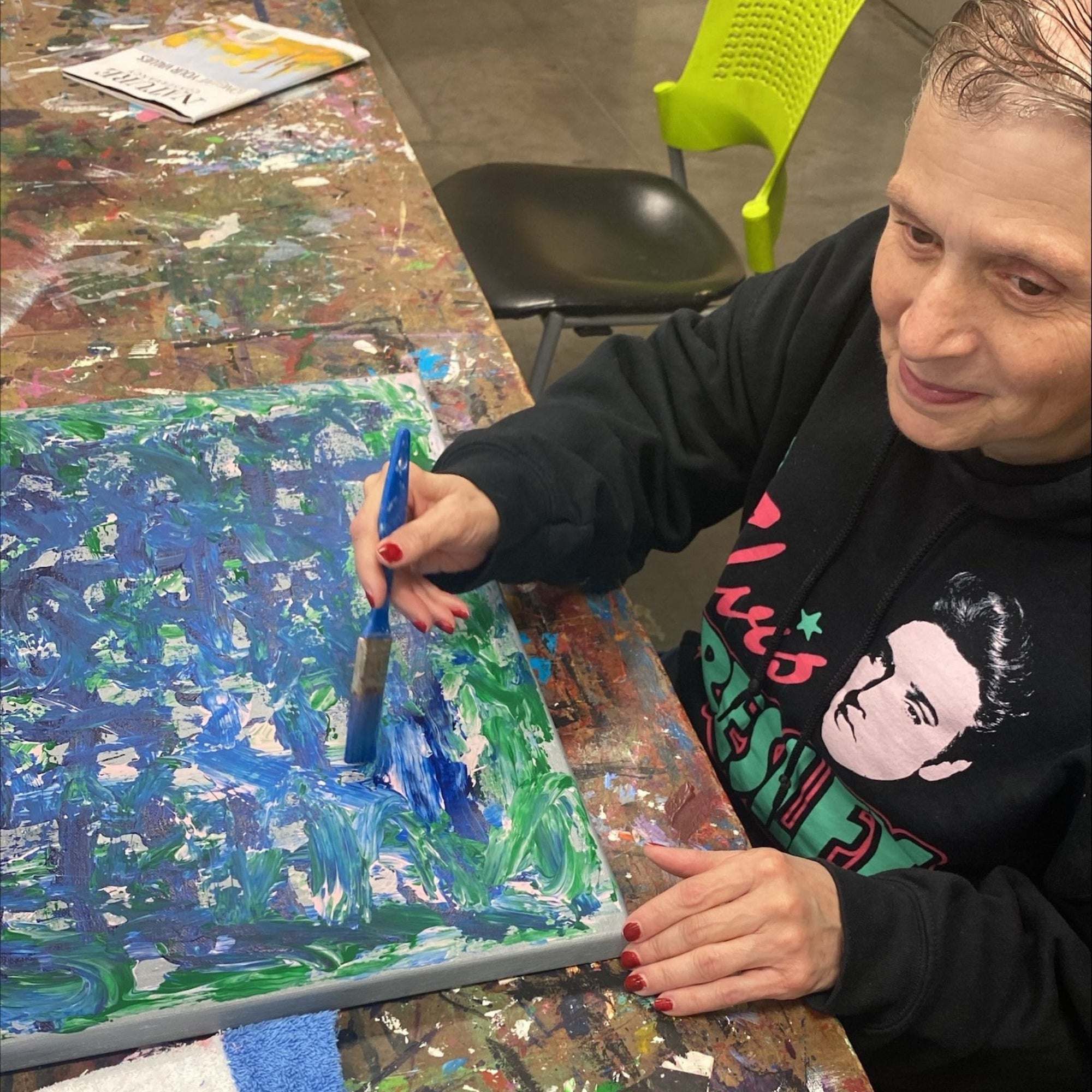 Leona is a passionate blind artist with a deep admiration for Elvis Presley, whose music and vibrant energy inspires much of her creative work, especially with dyed silk scarves. Leona enjoys painting on canvas as the tactile sensation of the canvas allows her to feel each stroke as she brings her creations to fruition.
